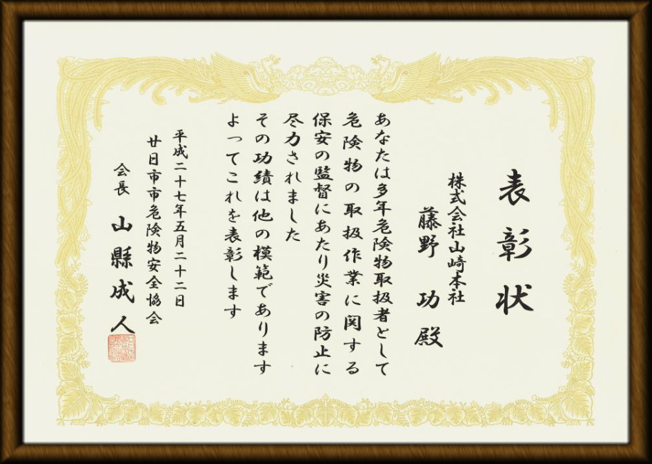 危険物取扱者として長年災害の防止に尽くしたとして、廿日市市危険物安全協会から表彰状が贈呈されました。(クリックで拡大します) |