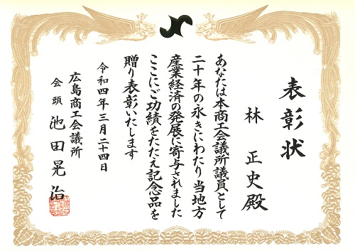 産業経済の発展と社会福祉の増進に寄与したことにより、広島商工会議所から表彰状が贈呈されました。 |