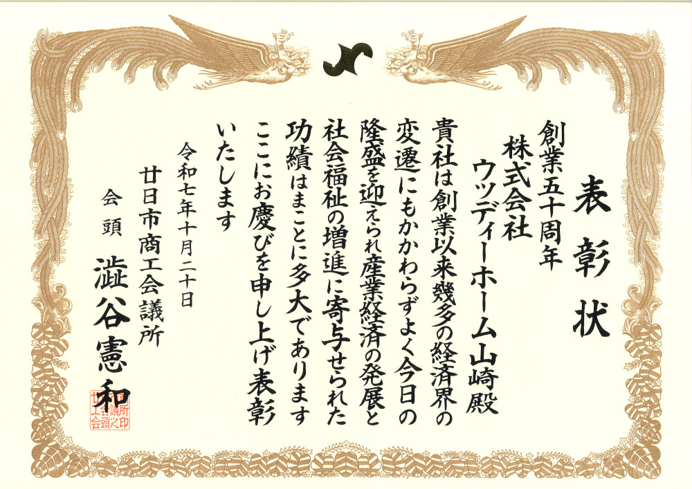 株式会社ウッディーホーム山崎が創業50周年を迎え、廿日市商工会議所の会頭から表彰されました。(クリックで拡大します) |