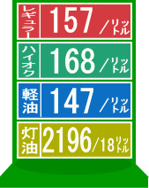 | <特典> ENEOSカードS会員の方は、ガソリン・軽油が店頭精算時に1リットルあたり1円引き、請求書でさらに1リットルあたり2円引きとなります(合計で、1リットルあたり一般価格よりも3円引きになります)。 また、灯油は請求書で1リットルあたり1円引きになります。 |